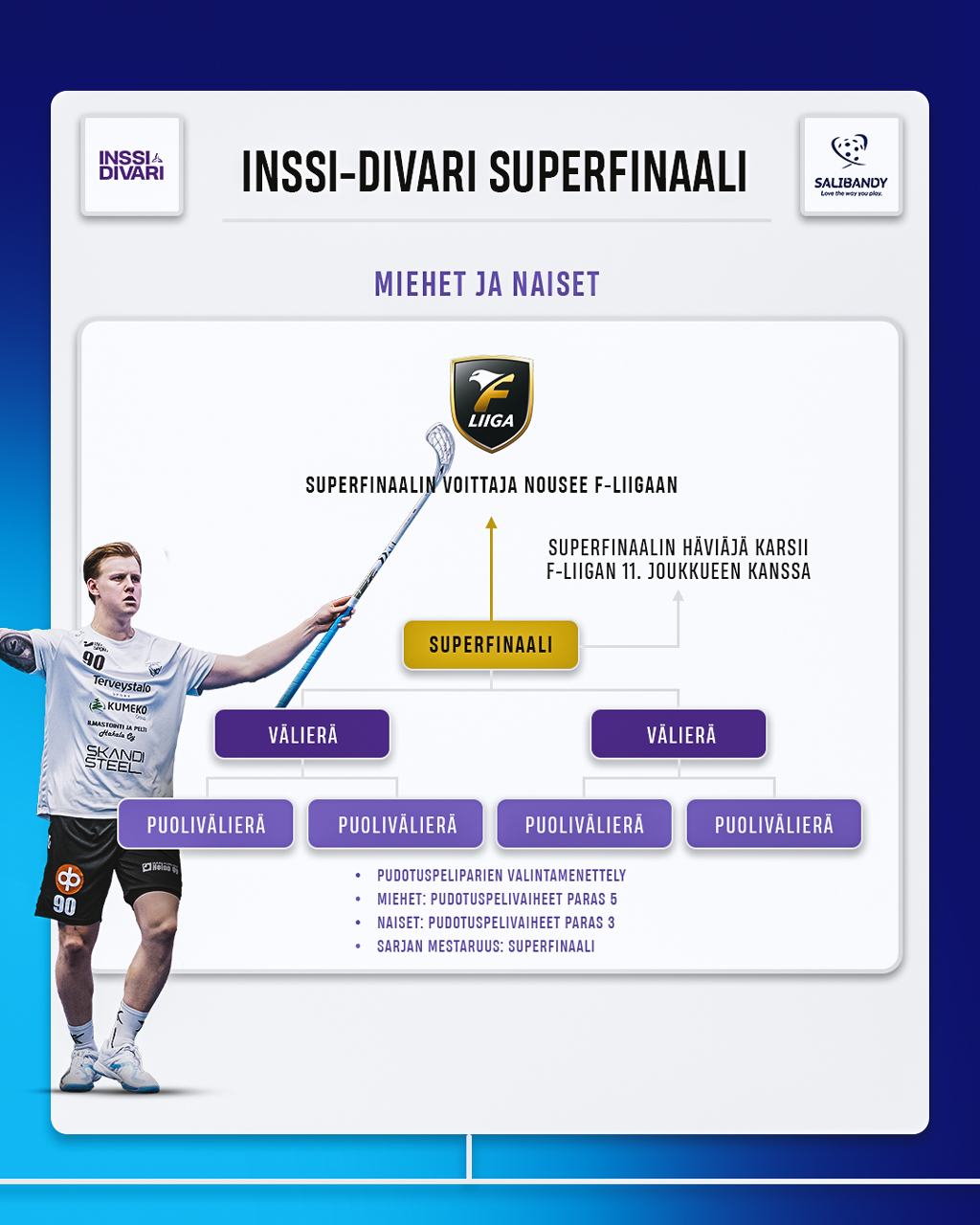 Merkittävin ja näkyvin uudistus on Superfinaalin tuominen F-liigan ja Inssi-Divarin tasonmittaukseen. Jatkossa sekä miesten että naisten F-liigan runkosarjan viimeiseksi jäänyt putoaa suoraan sarjaporrasta alaspäin. Inssi-Divarin mestarit puolestaan nousevat suoraan F-liigaan. Voittajat ratkotaan Superfinaaleissa eli yksittäisissä ison panoksen otteluissa. Superfinaaleihin joukkueet selvittävät tiensä Inssi-Divarin pudotuspelien kautta.