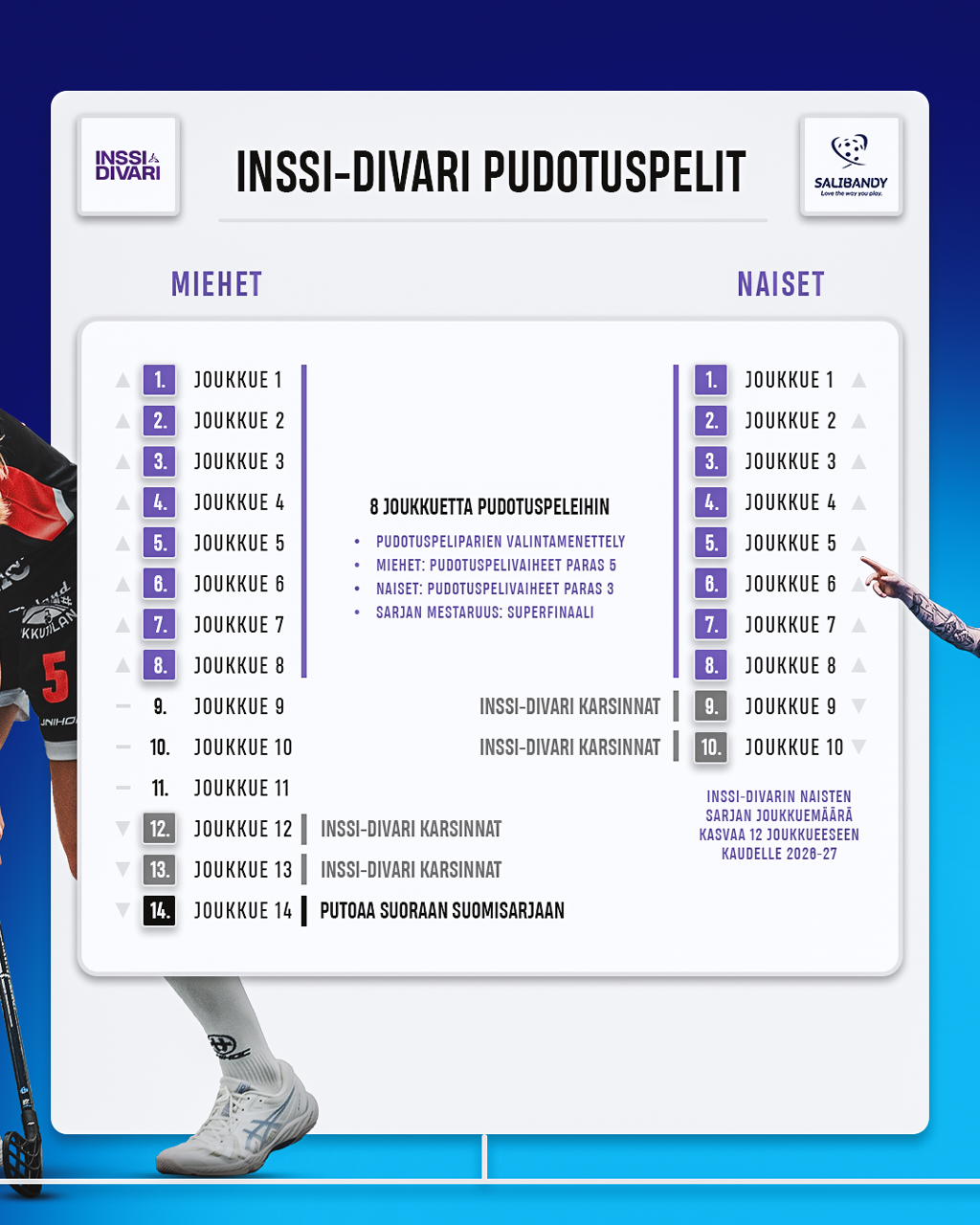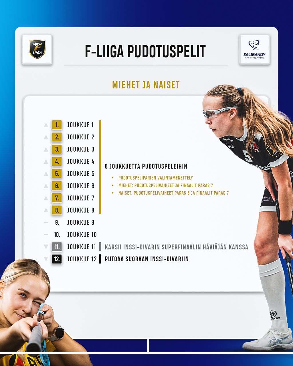 Inssi-Divarissa pudotuspelit tekevät paluun. Nyt F-liigakarsintojen muodossa pelattavat ratkaisupelit vaihtuvat malliin, jossa kahdeksan parasta sekä miehissä että naisissa pelaavat pudotuspelit. Miehissä puolivälierät ja välierät ovat paras viidestä -sarjoja ja naisissa paras kolmesta. Välierien voittajat etenevät Superfinaaliin taistelemaan sarjan mestaruudesta ja suorasta liiganoususta. Superfinaalien häviäjät pääsevät pelaamaan liigapaikasta vielä F-liigan 11. sijoittuneita joukkueita vastaan.