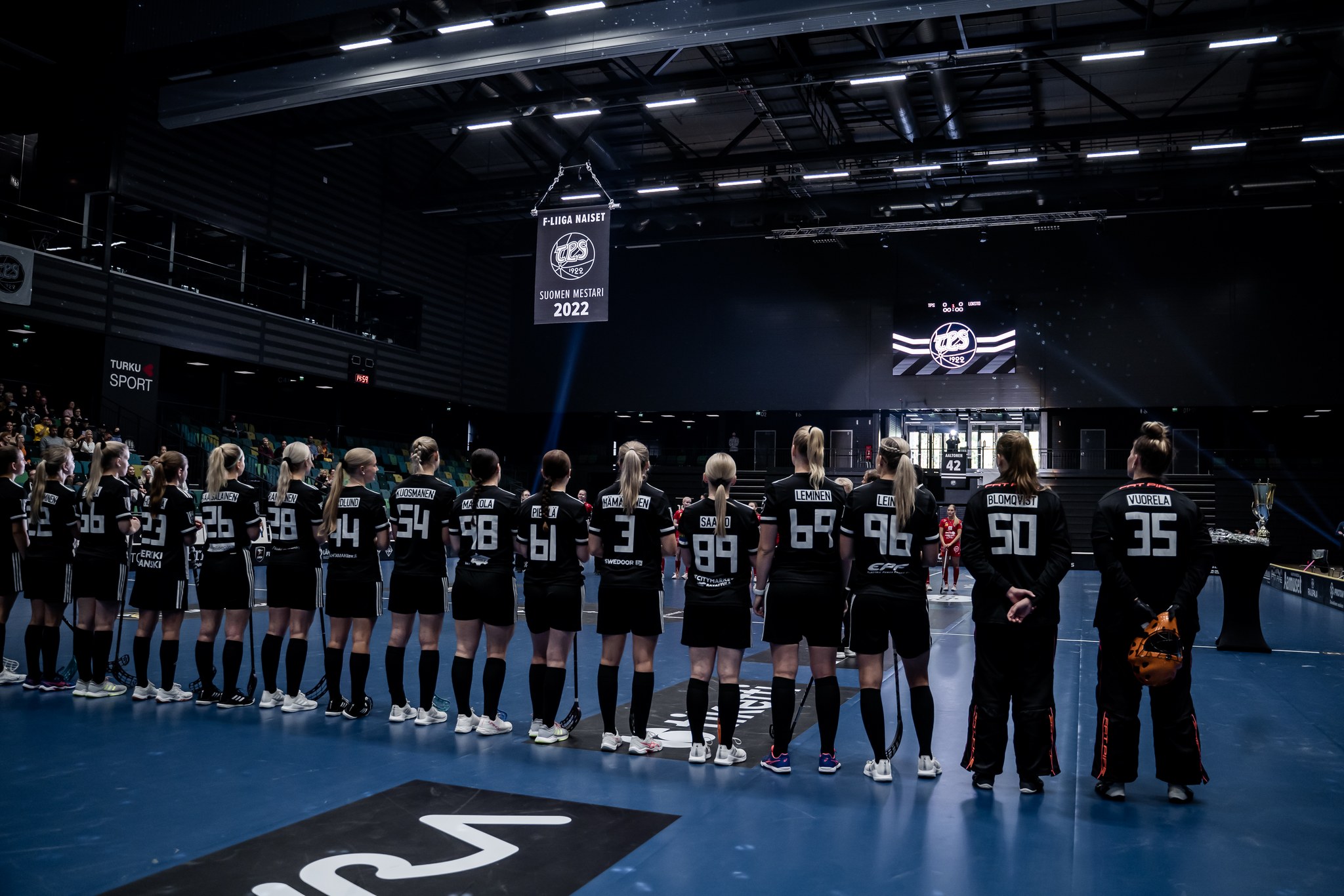 F-liigan naisten kausi 2022-2023 aloitettiin juhllallisuuksilla Turussa, kun TPS:n ensimmäinen mestaruusviiri nostettiin Kupittaan palloiluhallin korkeuksiin. Iltapäivä jatkui mustavalkoisena myös kentällä mestarien avatessa kautensa 12–2-murskavoitolla FBC Loistosta.