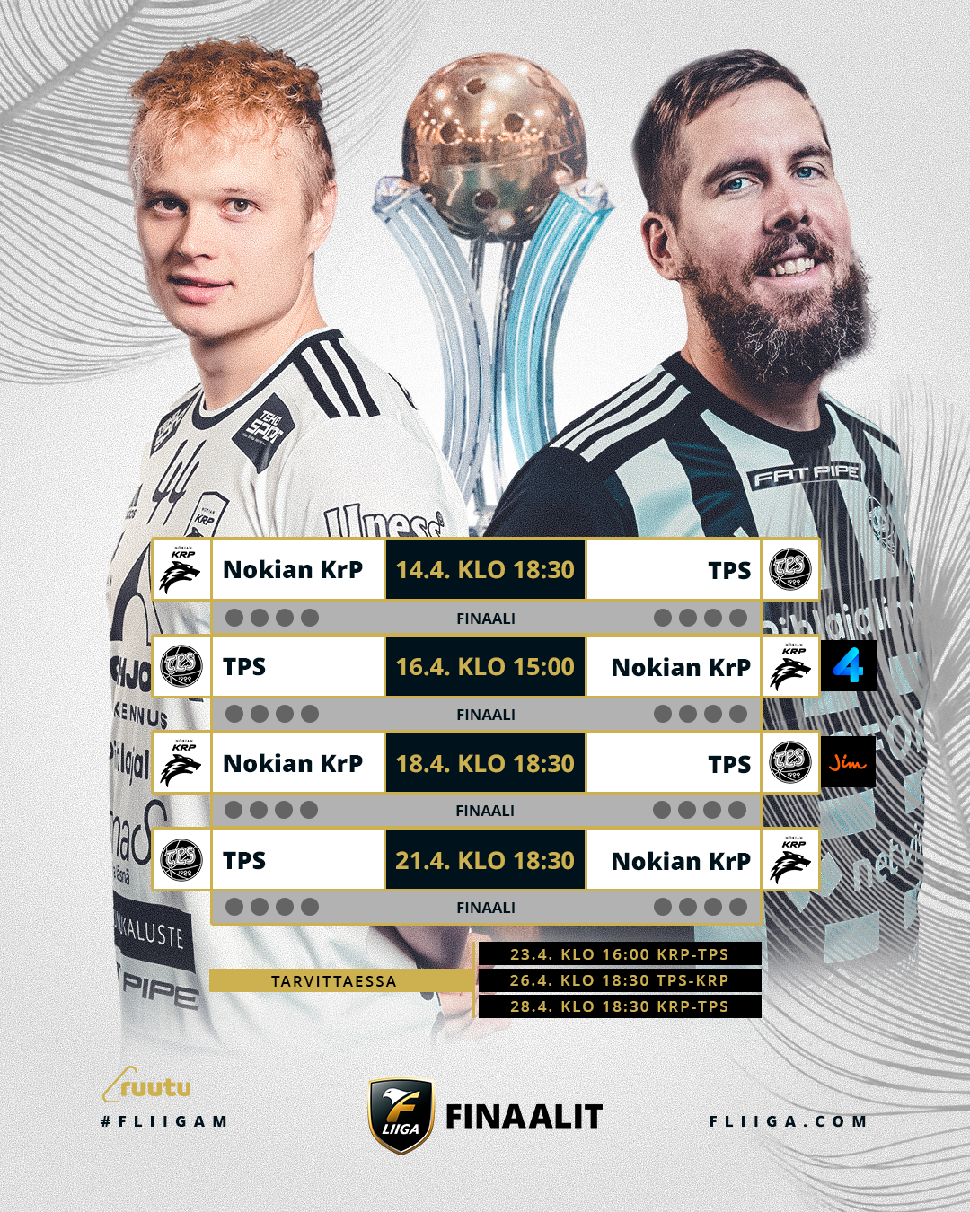 F-liigan miesten sarjan finaalit saadaan vauhtiin perjantaina 14. huhtikuuta, kun Nokian KrP ja TPS iskevät ensimmäisen kerran yhteen.